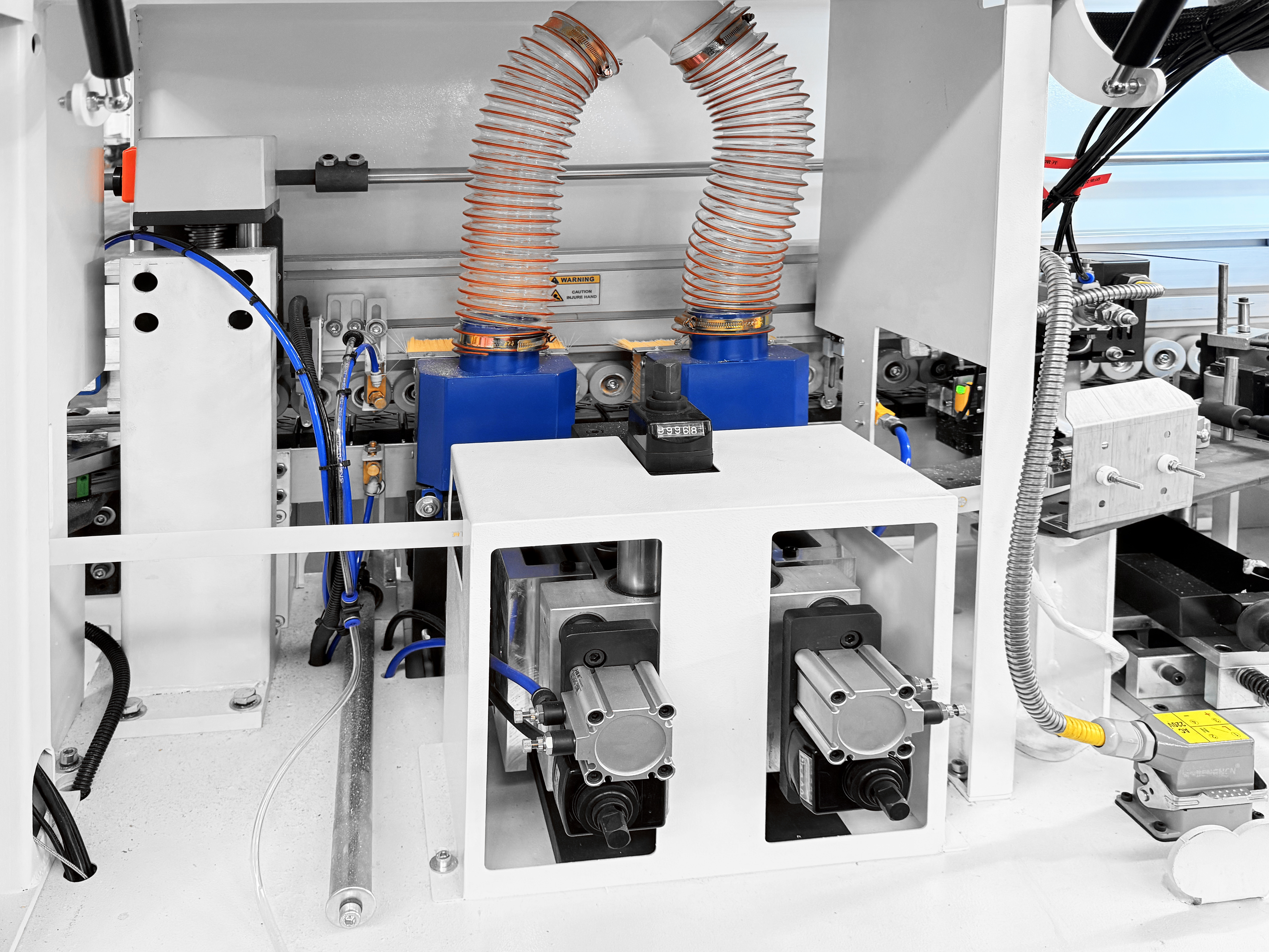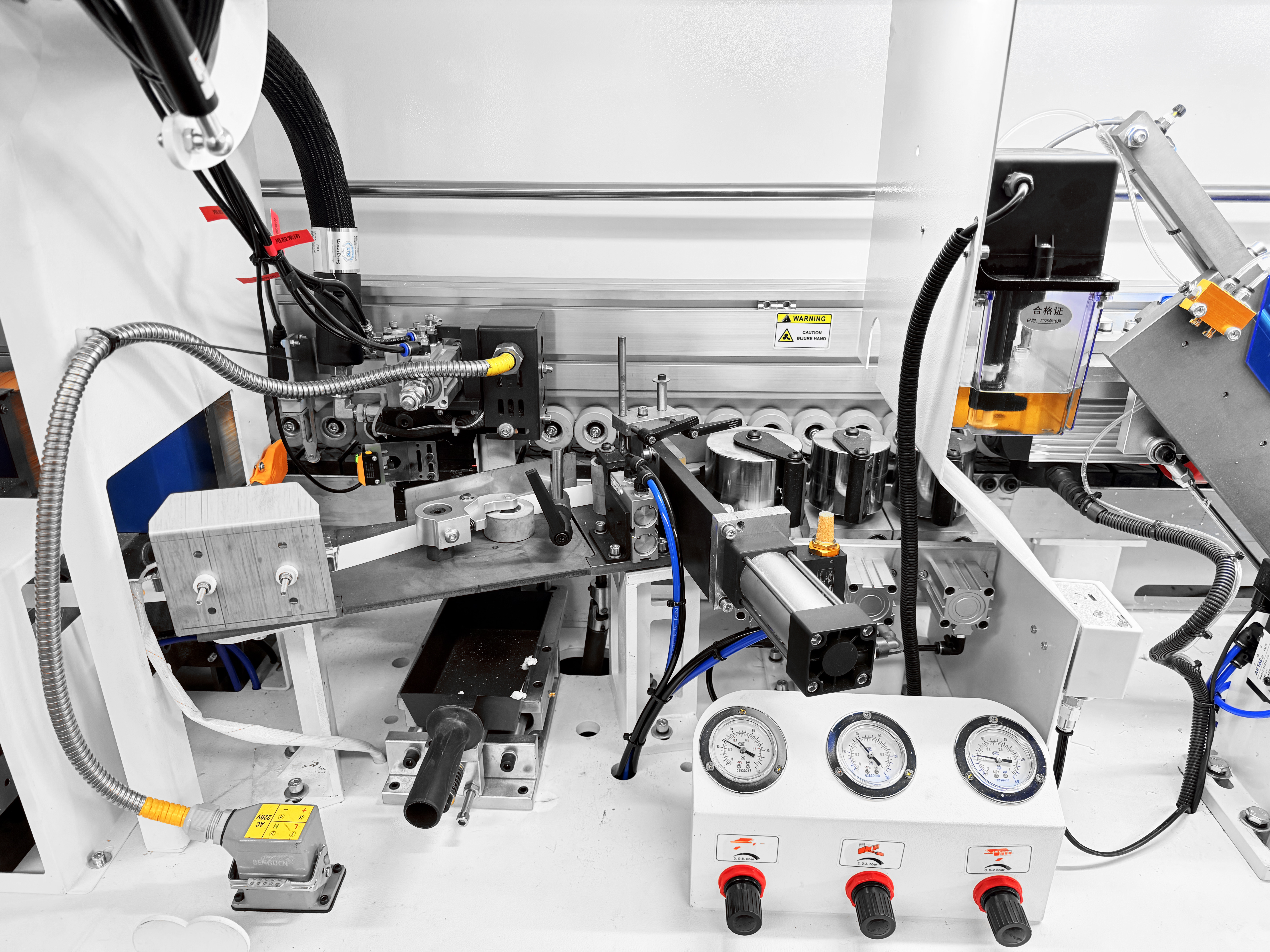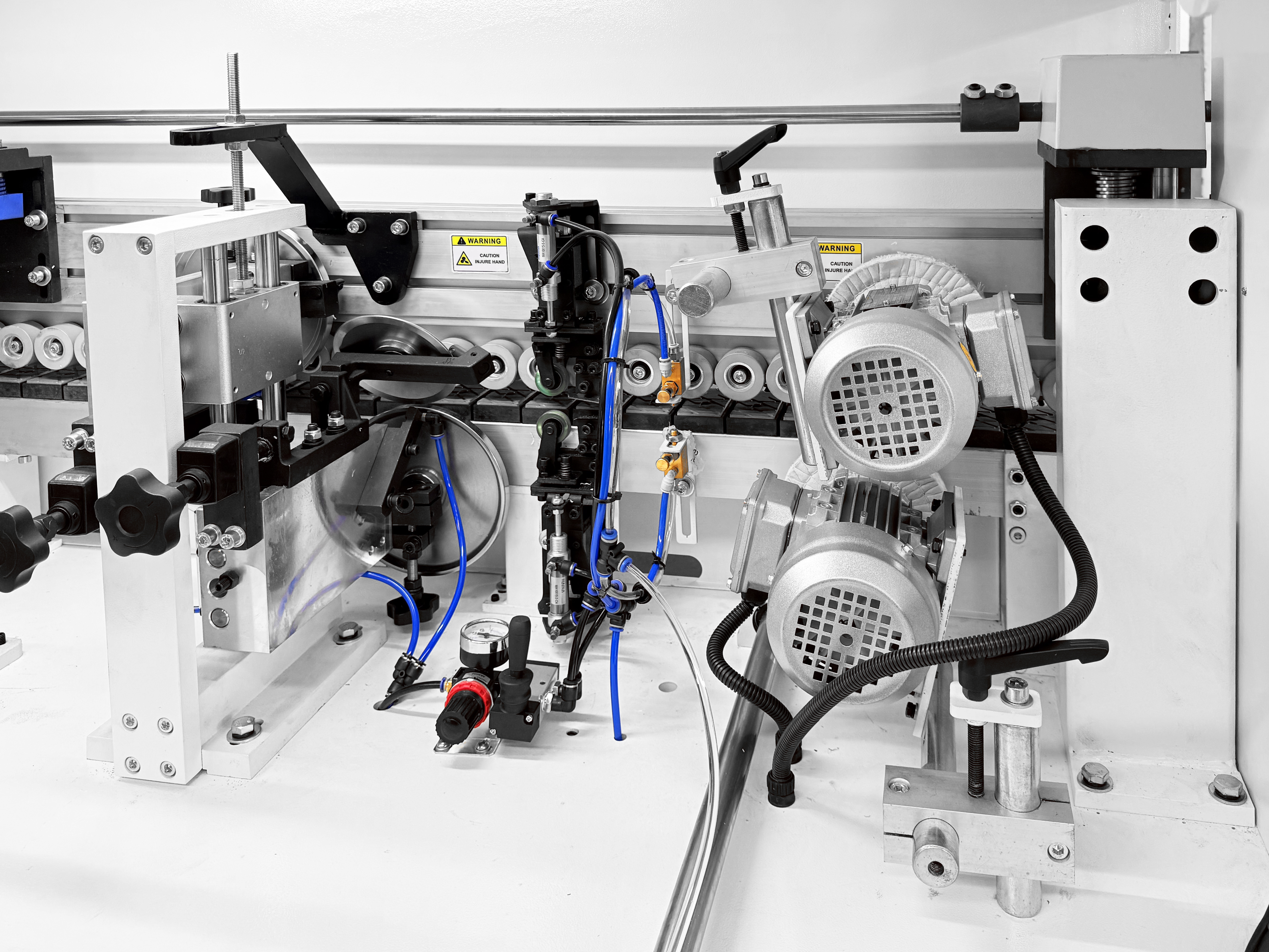 Прижимной блок с пневматическим управлением оснащен одним основным и двумя допрессовочными роликами со скребками, давление на ролики может регулироваться в зависимости от типа используемой кромки и деталей. Каждый ролик оснащен индивидуальным пневмоцилиндром.