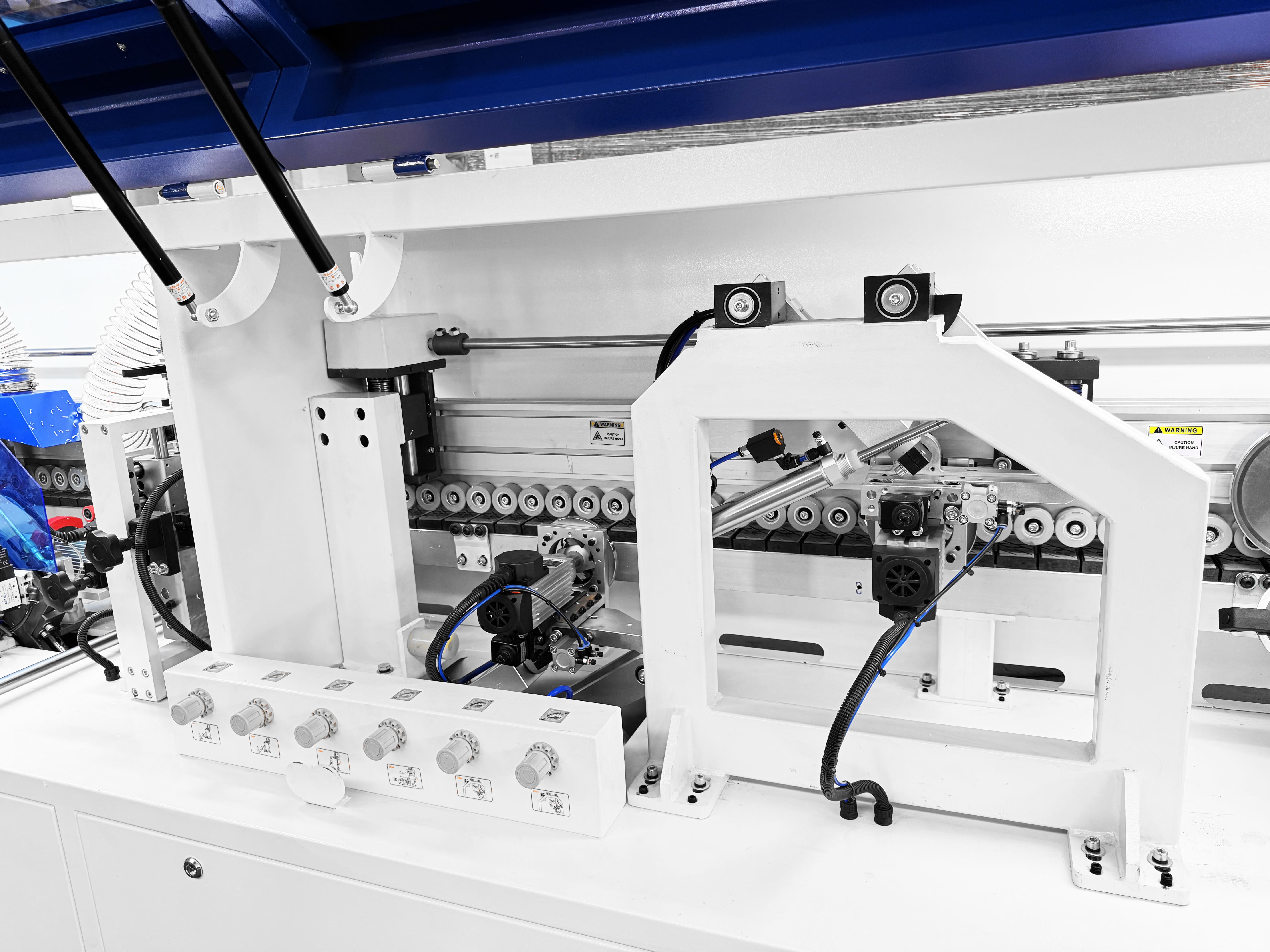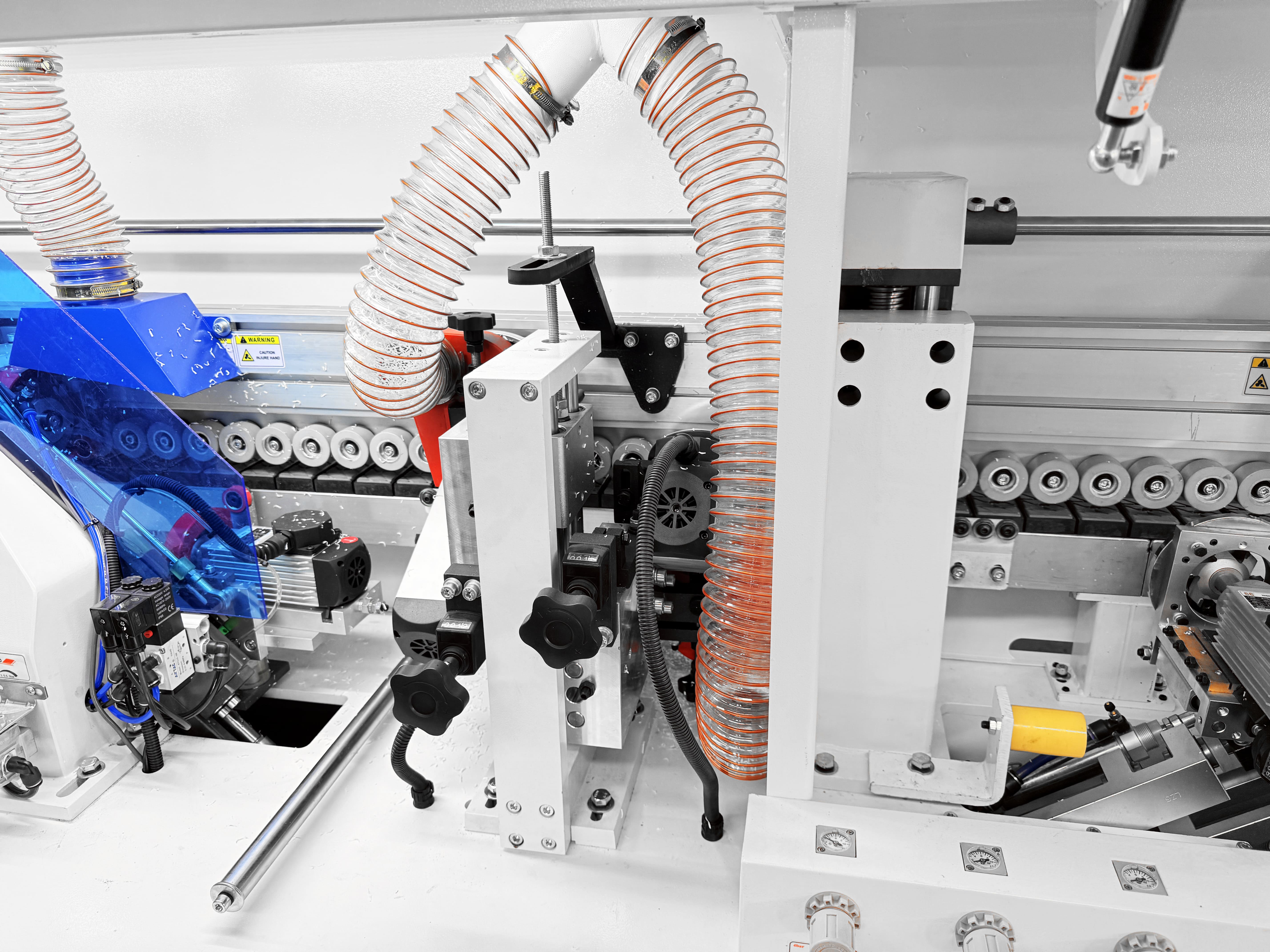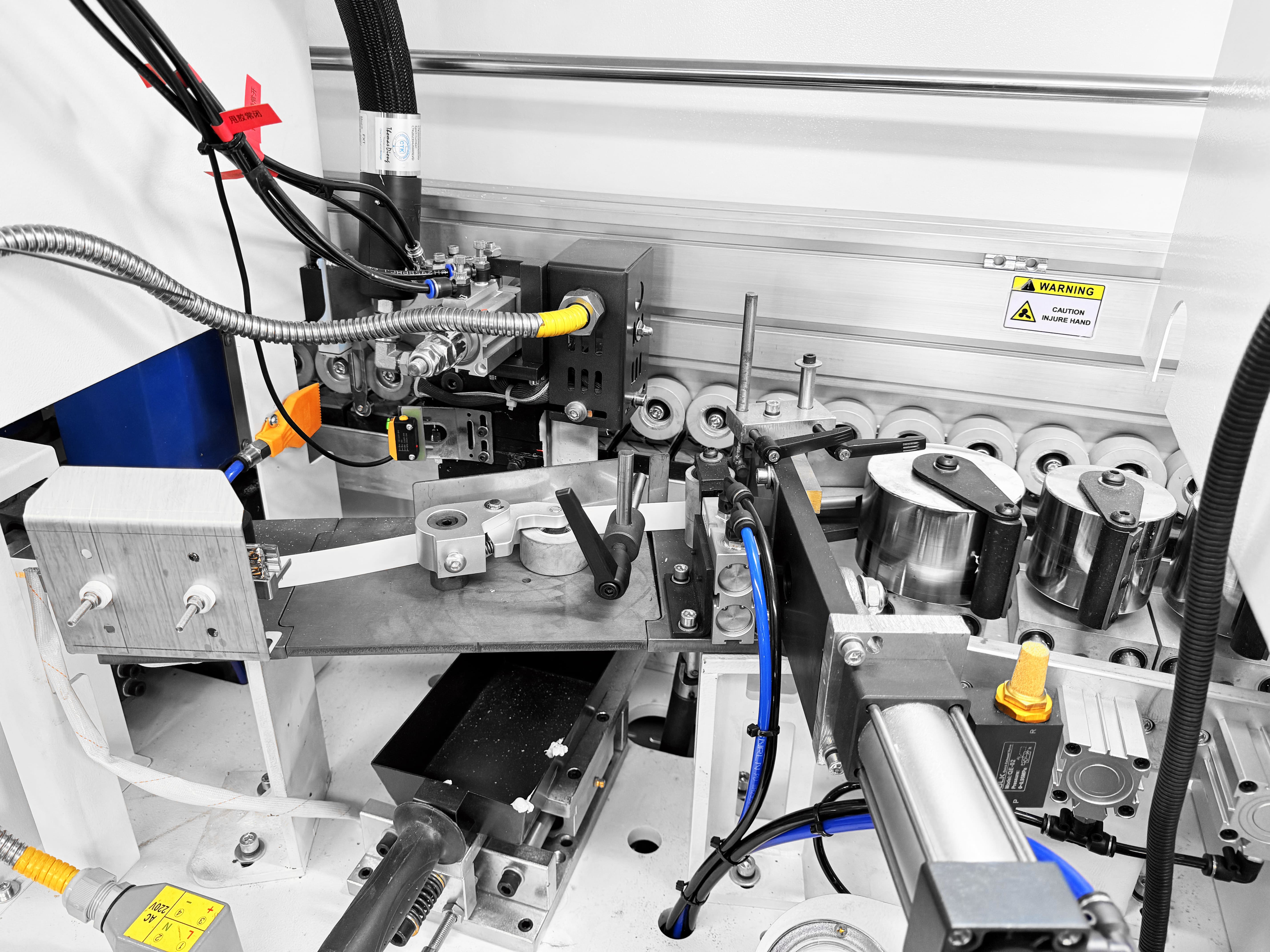 Прижимной блок с пневматическим управлением оснащен одним основным и двумя допрессовочными роликами со скребками, давление на ролики может регулироваться в зависимости от типа используемой кромки и деталей. Каждый ролик оснащен индивидуальным пневмоцилиндром.