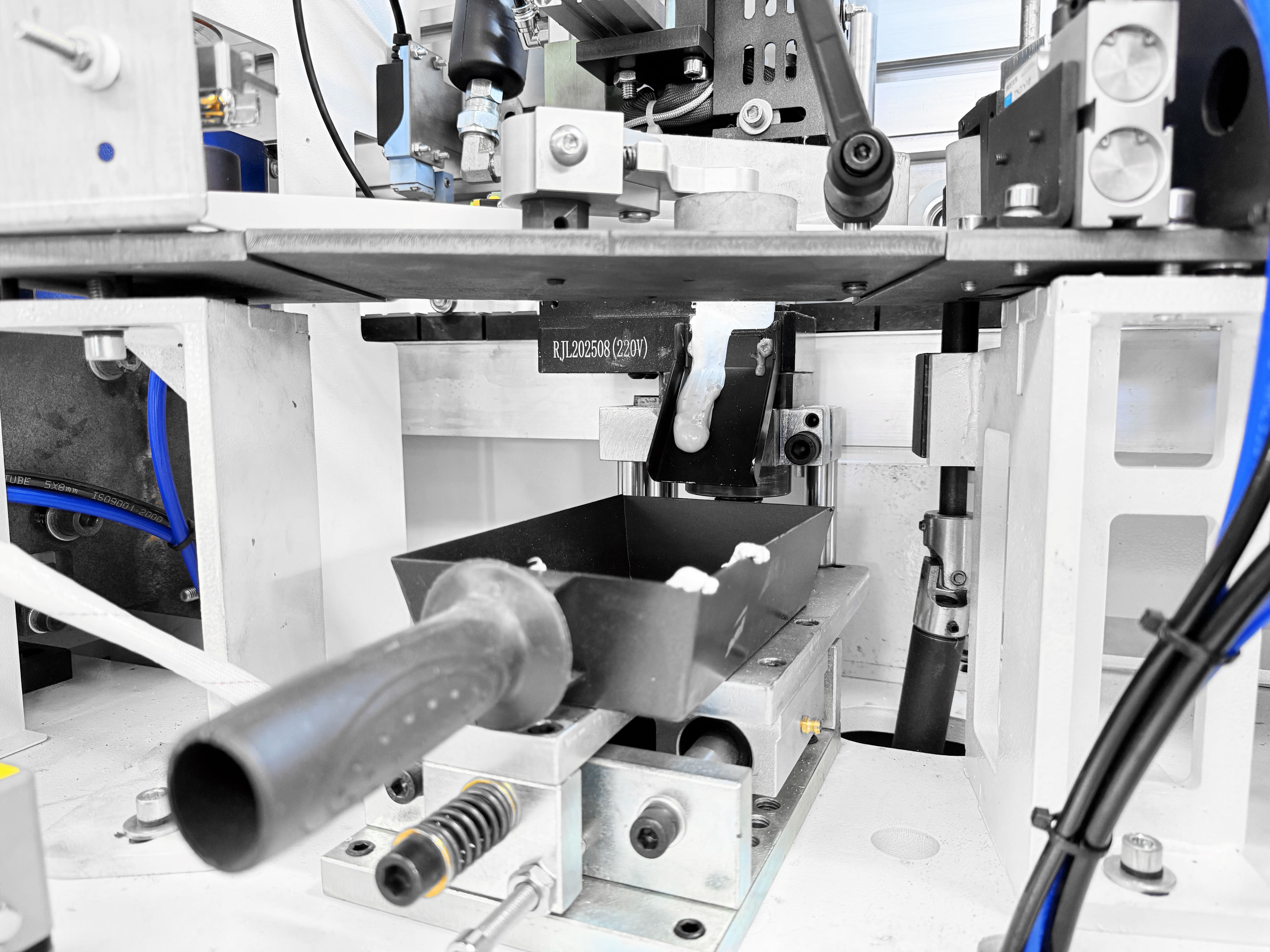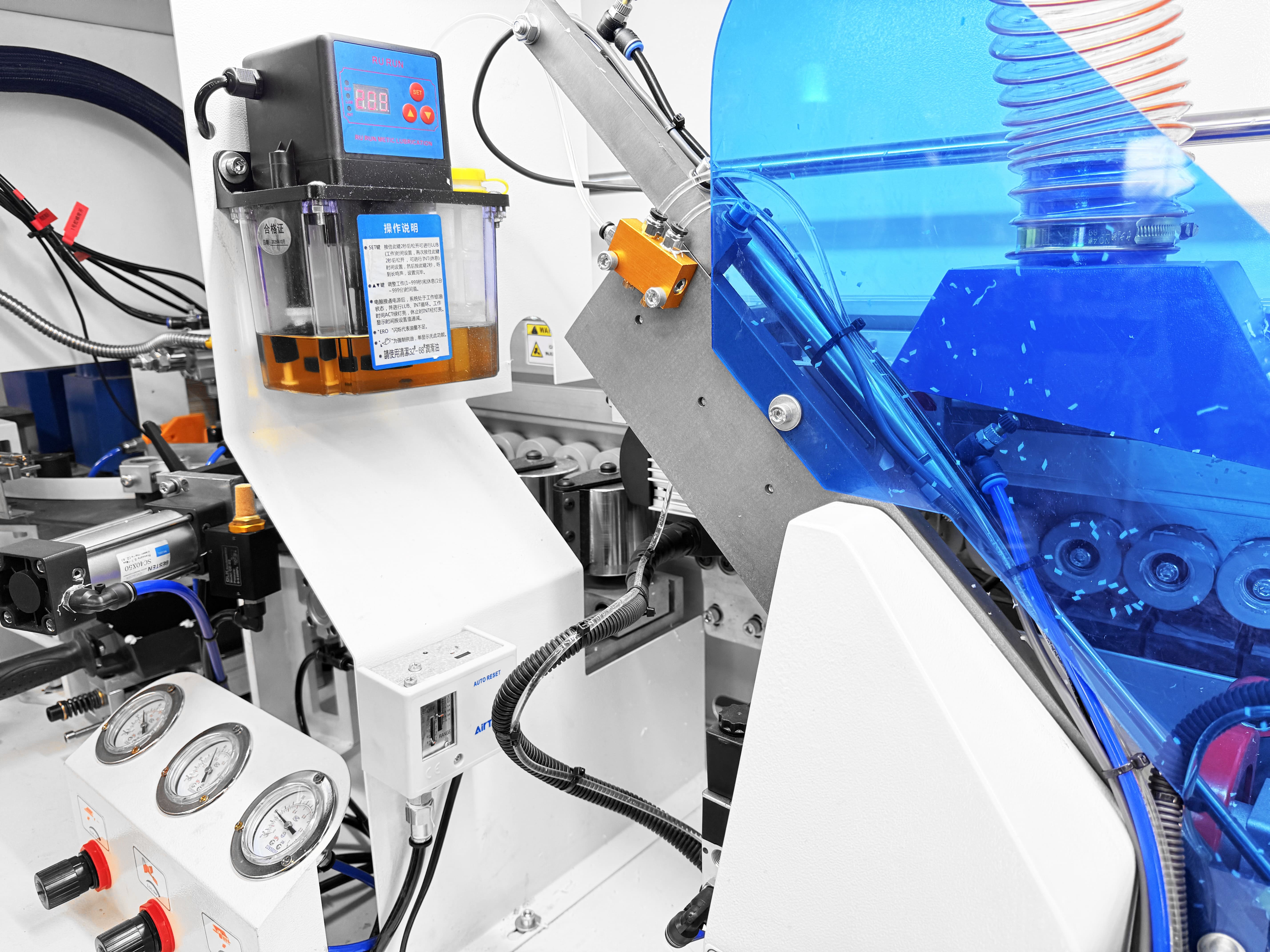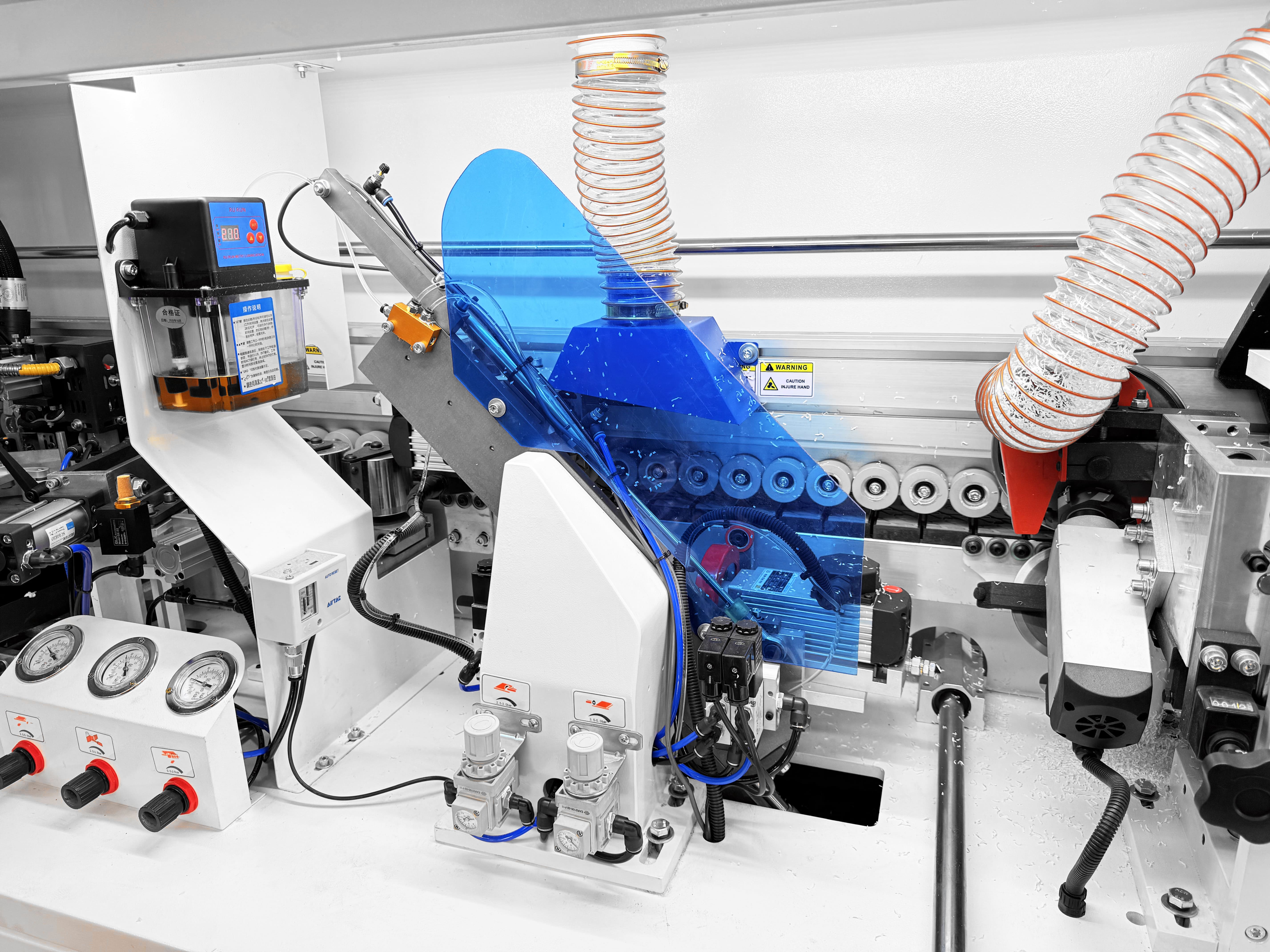Прижимной блок с пневматическим управлением оснащен одним основным и двумя допрессовочными роликами со скребками, давление на ролики может регулироваться в зависимости от типа используемой кромки и деталей. Каждый ролик оснащен индивидуальным пневмоцилиндром.