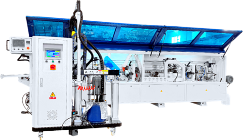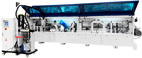 Узел подачи кромки точно и деликатно подает кромочный материал в зону приклеивания, обеспечивая минимальный свес кромки в начале детали. Может работать с рулонным кромочным материалом толщиной от 0,4 до 3 мм и с полосовым кромочным материалом.