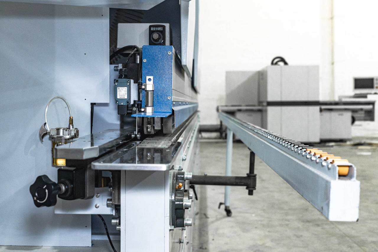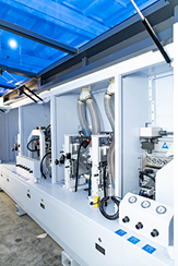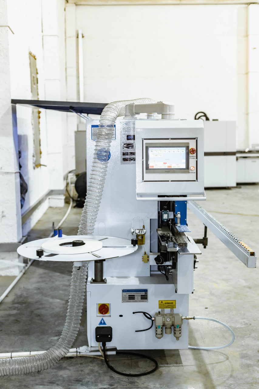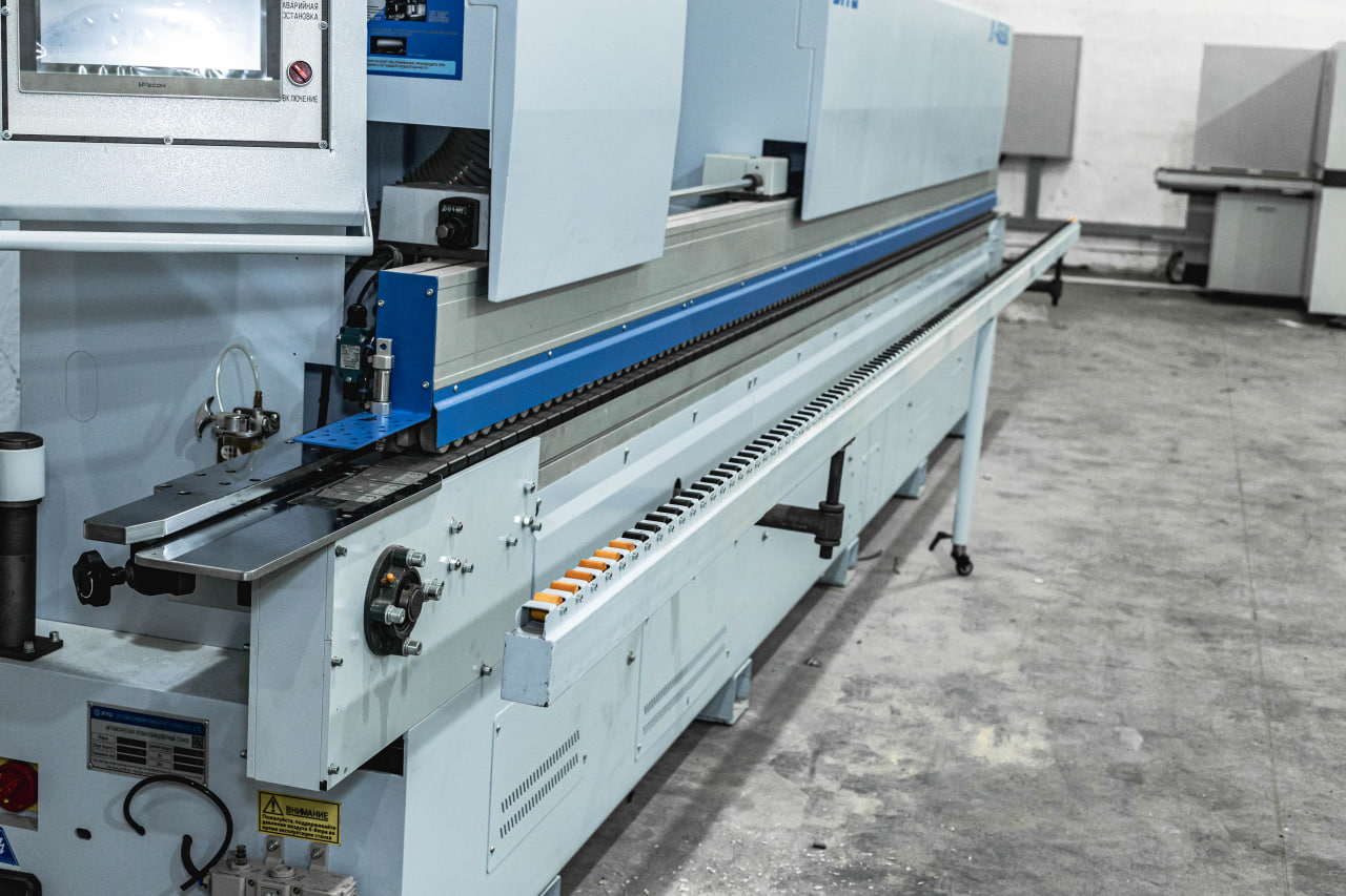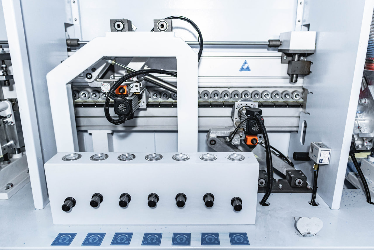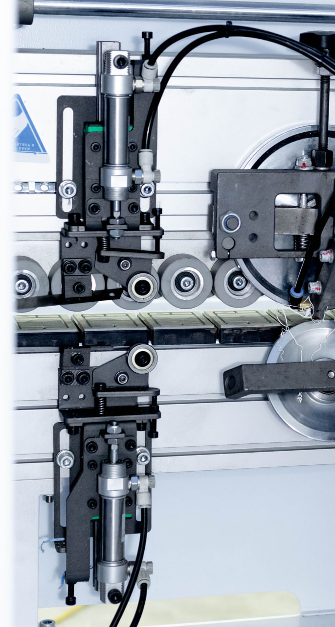 Клеевая ванна с нижним расположением, не требует перенастройки на толщину материала, обеспечивает безупречное нанесение клеярасплава на торец обрабатываемой детали. Узел подачи кромки точно и деликатно подает кромочный материал в зону приклеивания, обеспечивая минимальный свес кромки в начале детали. Может работать с рулонным кромочным материалом толщиной от 0,4 до 3мм и с полосовым кромочным материалом.
