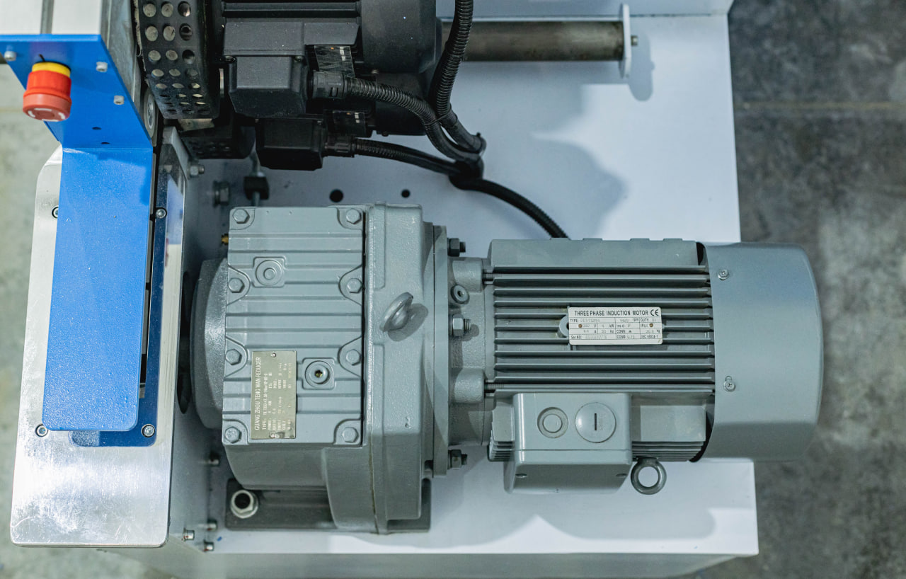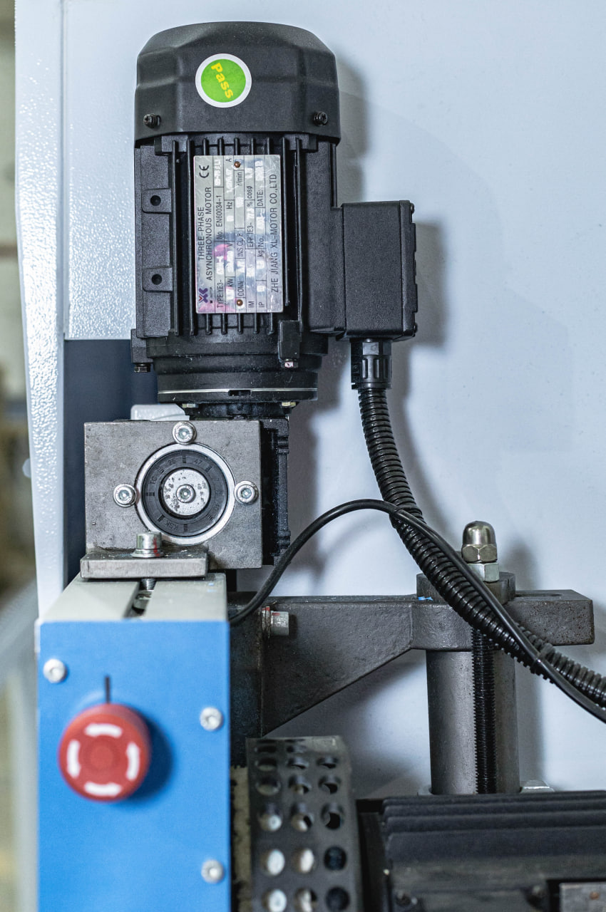Надежный редуктор приводится во вращение эл. двигателем 2,2кВт и позволяет развивать скорость до 23м/мин. Система направляющих позволяет точно и без вибраций перемещать детали относительно узлов обработки.