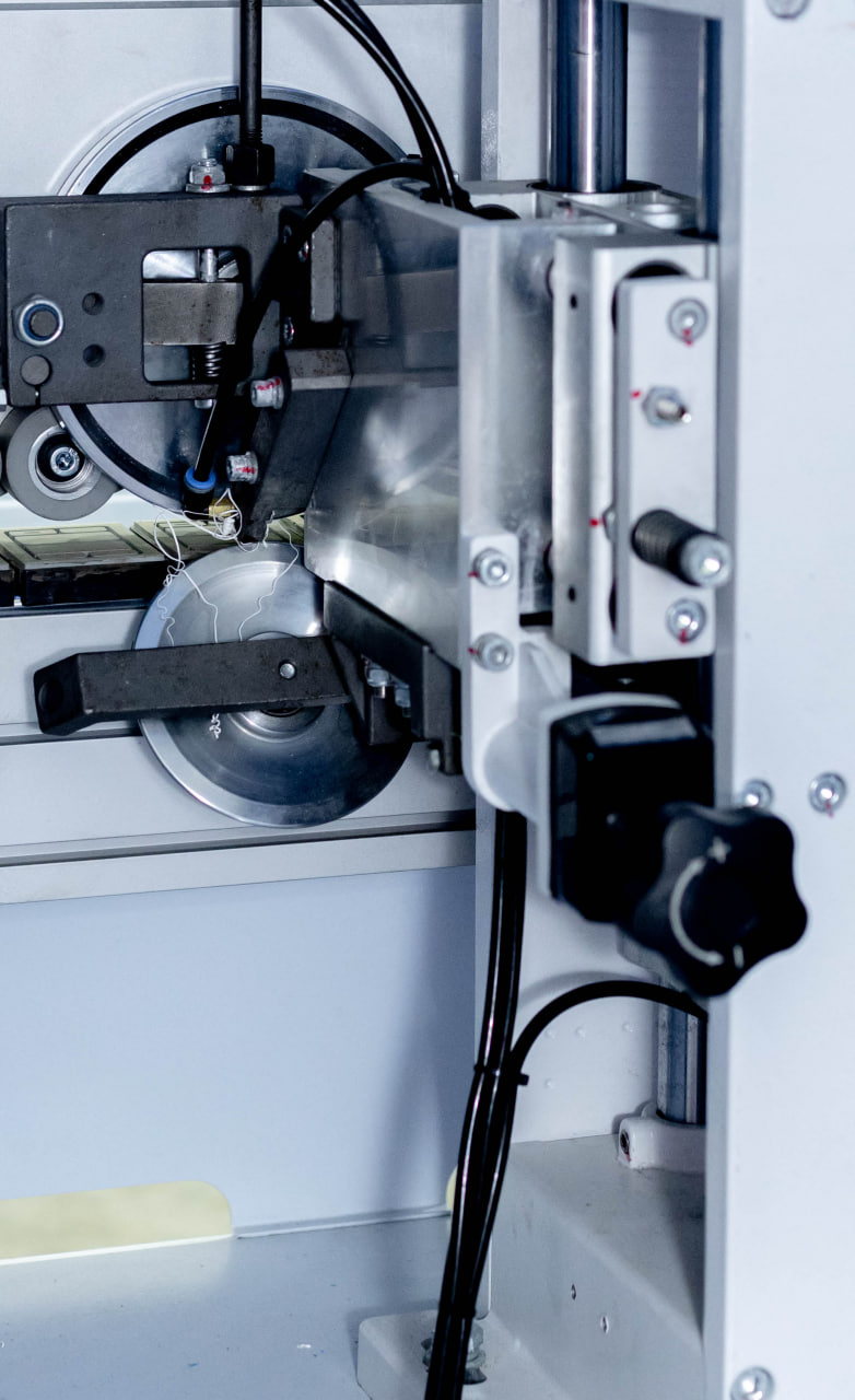 Узел прифуговки с двумя моторами по 2.2квт и алмазными фрезами. Узел предварительного фрезерования (прифуговка) оснащен двумя высокооборотистыми моторами по 2.2 кВт 12000 об/мин. Алмазный инструмент обеспечивает безупречное фрезерование материала высотой до 35мм. Опционально возможна установка фрез для обработки плиты до 60мм.