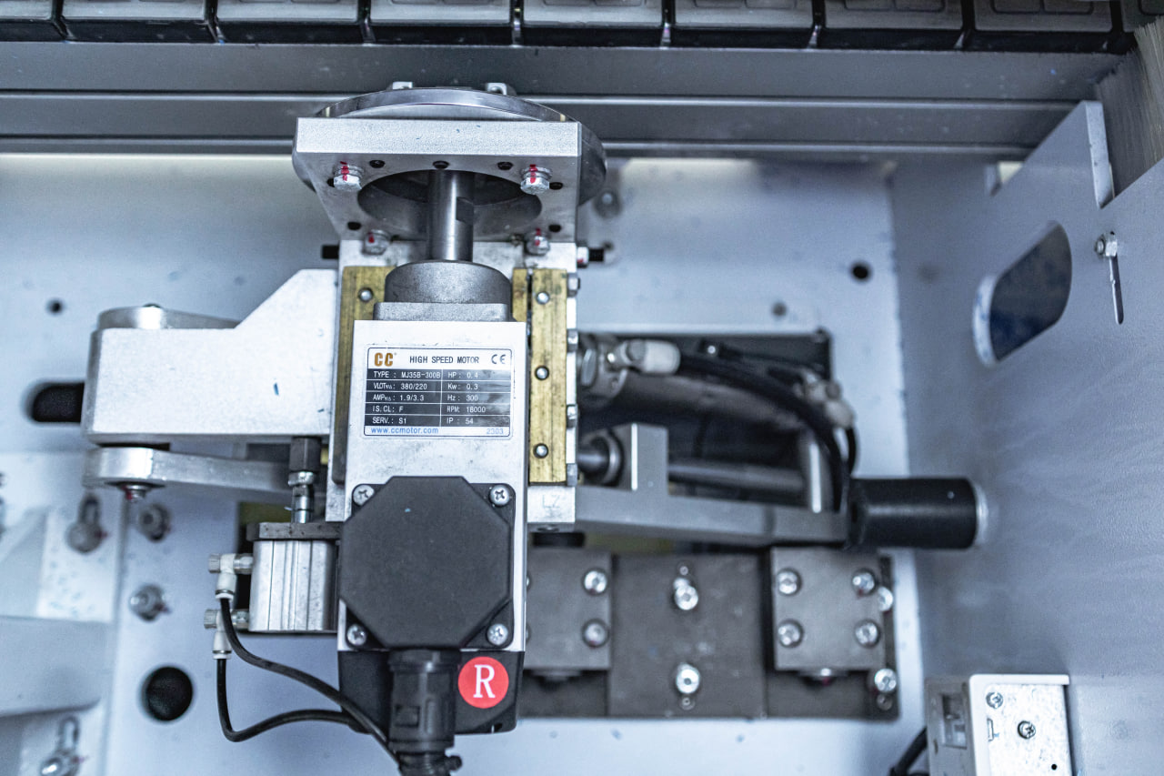 Оснащен двумя высокооборотистыми моторами по 0,75 кВт с оборотами 18000 об/мин с шестиножевыми фрезами R2.Массивные копировальные устройства точно повторяют геометрию детали и обеспечивают безупречную финишную обработку. Настройка копировальных устройств осуществляется с помощью точных цифровых счетчиков