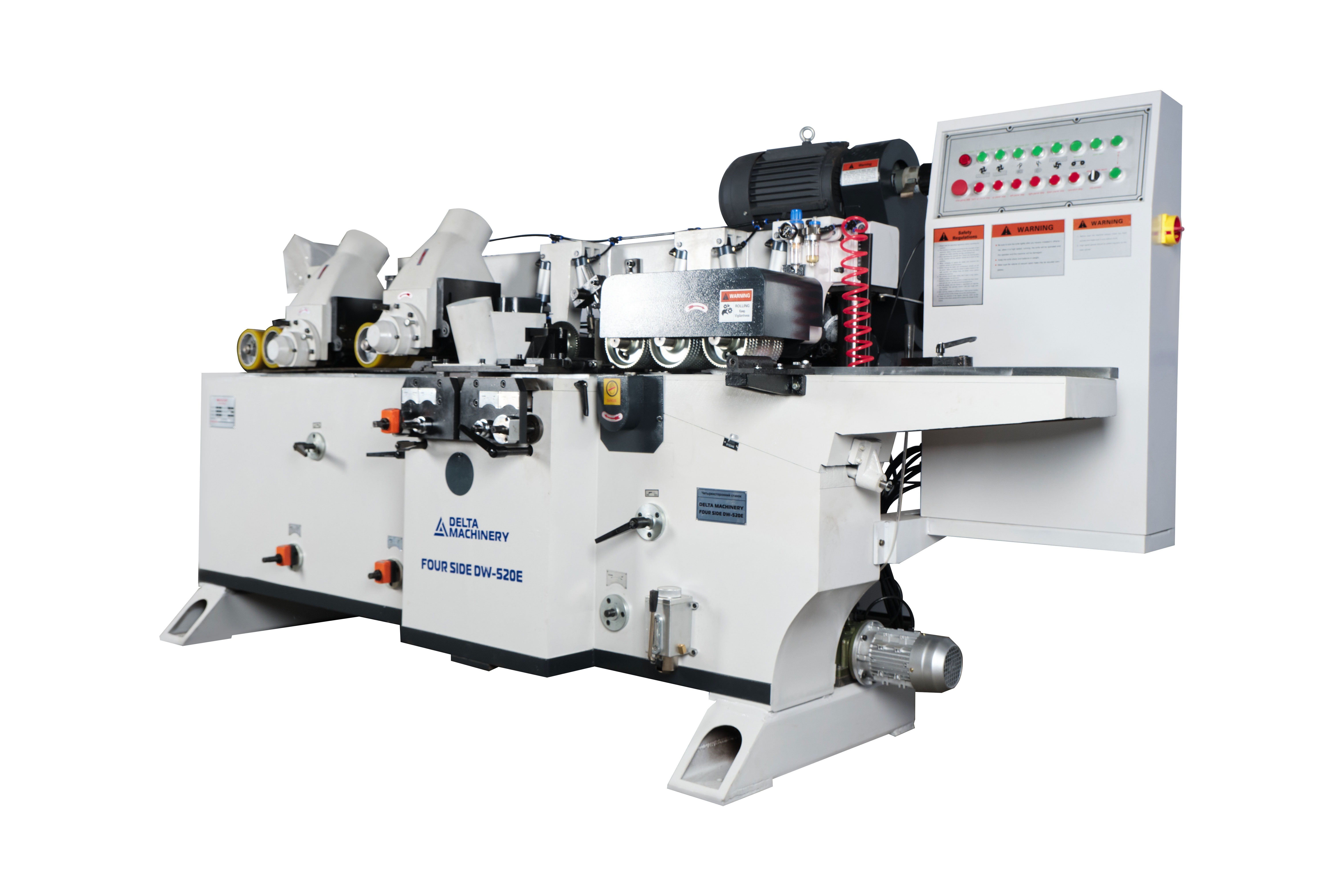 Четырёхсторонний станок DELTAMACHINERY FOUR SIDE DW-520H  (5 шпинделей) предназначен для высокоточной четырехсторонней обработки деревянной заготовки с целью получения высококачественных изделий за один проход. После обработки на 4-х сторонних станках отпадает необходимость в последующем шлифовании профилированных и строганных поверхностей.