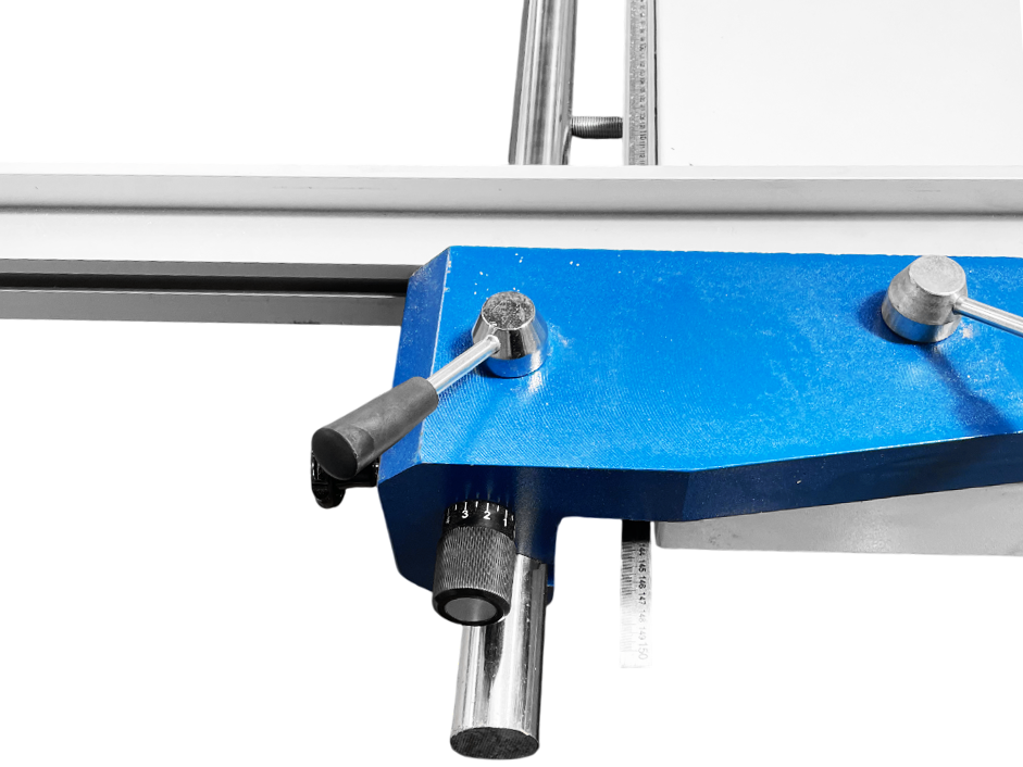Станок оснащен прямой регулировкой подрезной пилы влево/вправо по отношению к основной пиле – это самая главная регулировка «подрезки», что позволят оператору произвести настройку быстро и точно, за счет отсутствия люфтов. Для регулировки вылета подрезной пилы вверх/вниз используется удобная рукояткой расположенная со стороны параллельного упора по классической схеме.