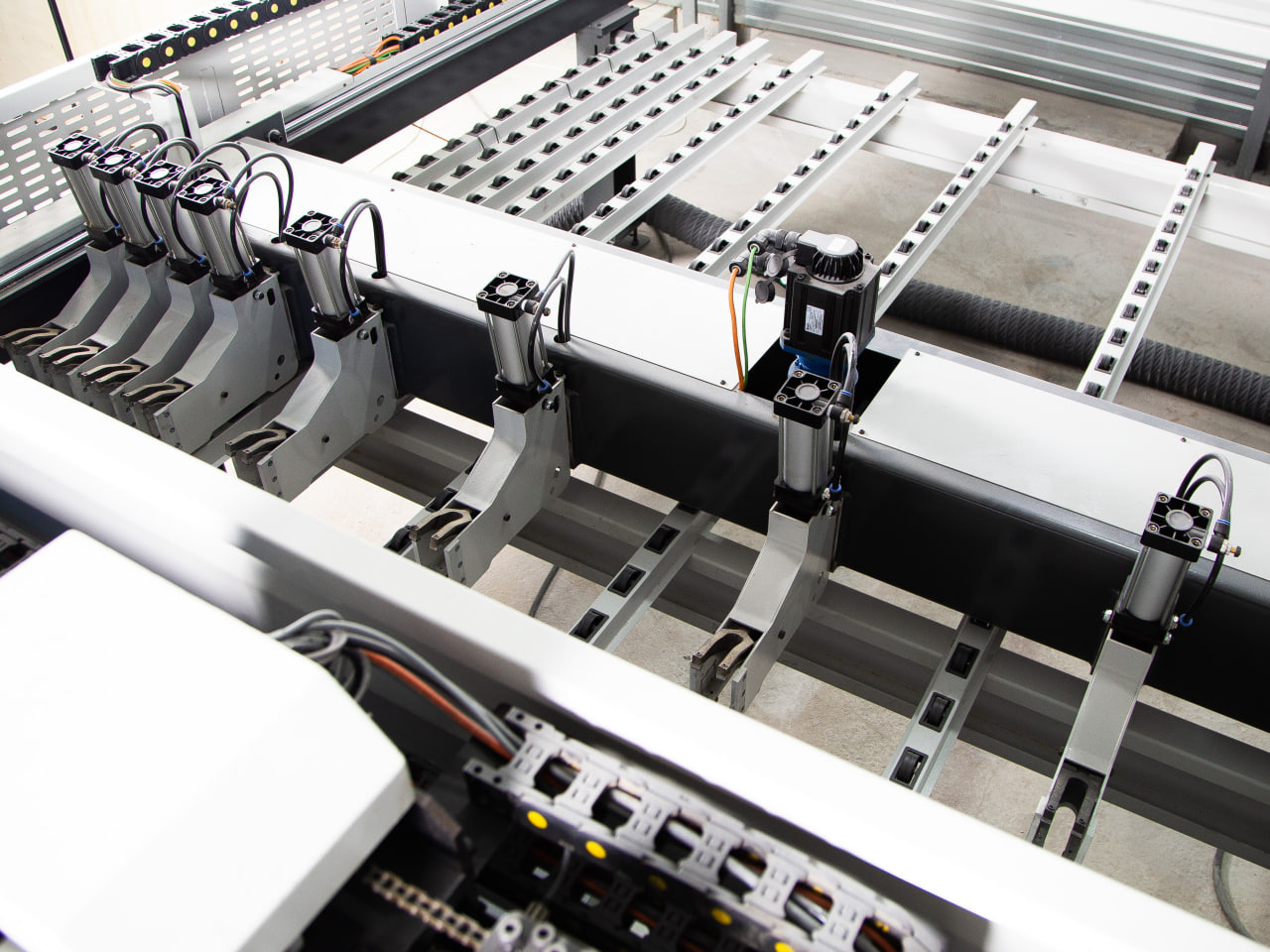 Двойная система бокового выравнивания оснащена независимыми роликами поддержки по двум сторонам зоны пиления. Привод выравнивателя цепной, оснащен энкодером для безупречной точности позиционирования.