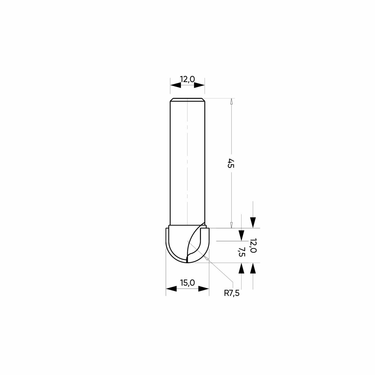 Фреза алмазная DELTA TOOLS R7,5 D=15 l=12 L=57 S=12*45 RH "Галтель" арт. DT39