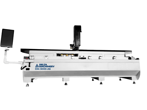 Поворотный стол с тремя устройствами для фиксации заготовки при помощи пневматических цилиндров. Рабочий стол может поворачиваться на 180°, фиксируясь в трех положениях: -90° / 0° / +90°. Это позволяет обрабатывать профиль с трех сторон за один зажим.