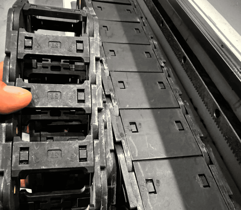 Для укладки электрических кабелей в станках серии Basis Cut применяются траки закрытого типа, что исключает возможность попадания стружки и мелких обрезков материала в зону транспортировки кабелей и защищает кабеля от повреждений.