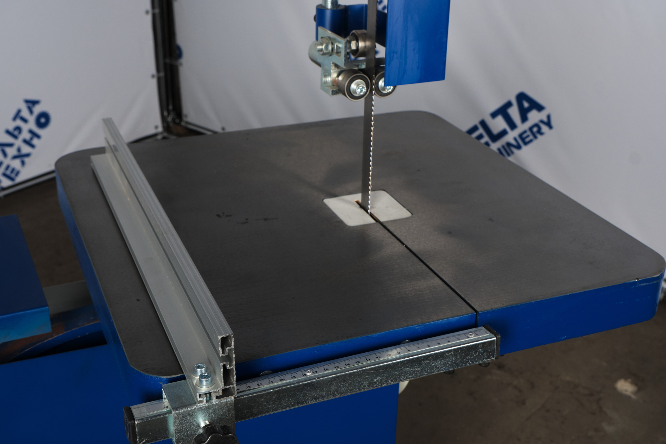 Массивный рабочий стол из серого чугуна. Направляющая линейка на столе настраивается по миллиметровой шкале. Толкатель с угловой шкалой для удобства подачи заготовок.