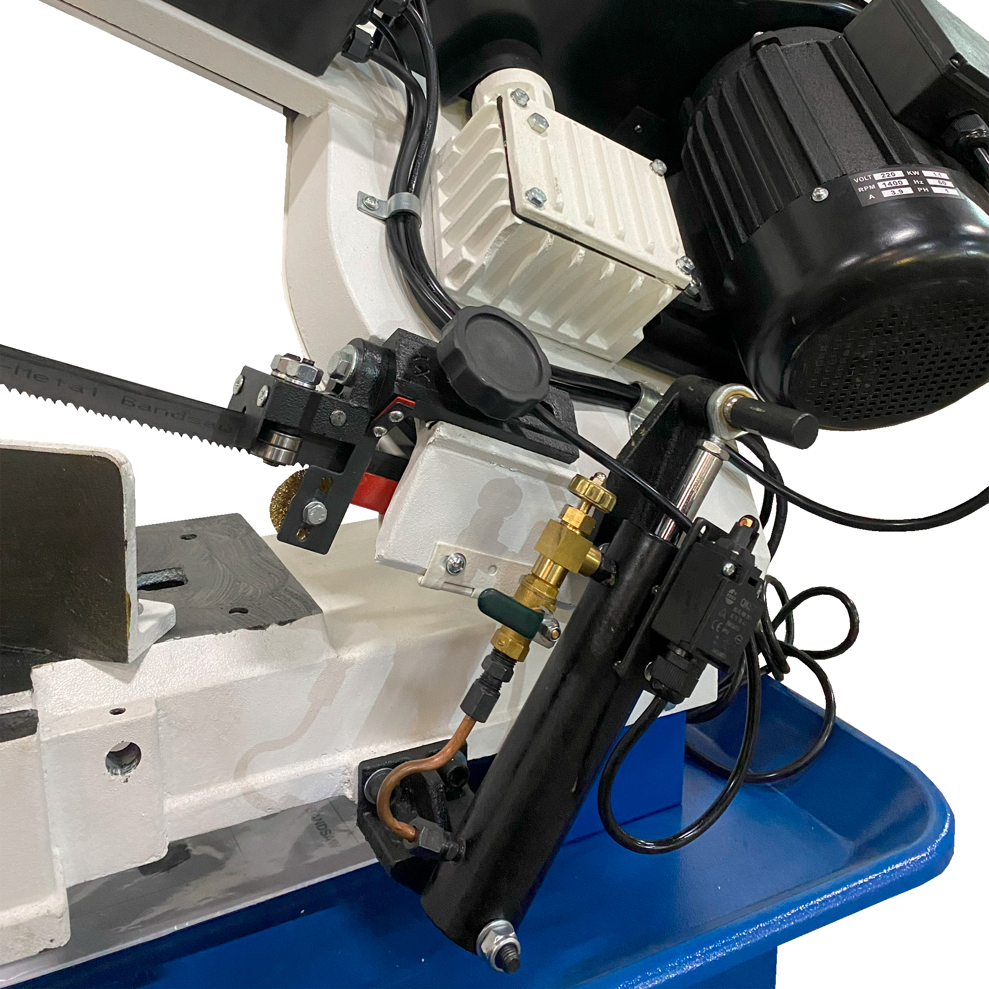 Пильная рама поднимается вручную, а опускается за счет гидроразгрузки. Скорость опускания регулируется с помощью вентиля, расположенного на гидроцилиндре, а также станок включает в комплектацию систему позволяющую отключение пильного узла при достижении нулевой точки, которая запрограмированна в станок с завода, Это позолит обеспечить безопасность с работой этого станка и экономию электроэнергии.