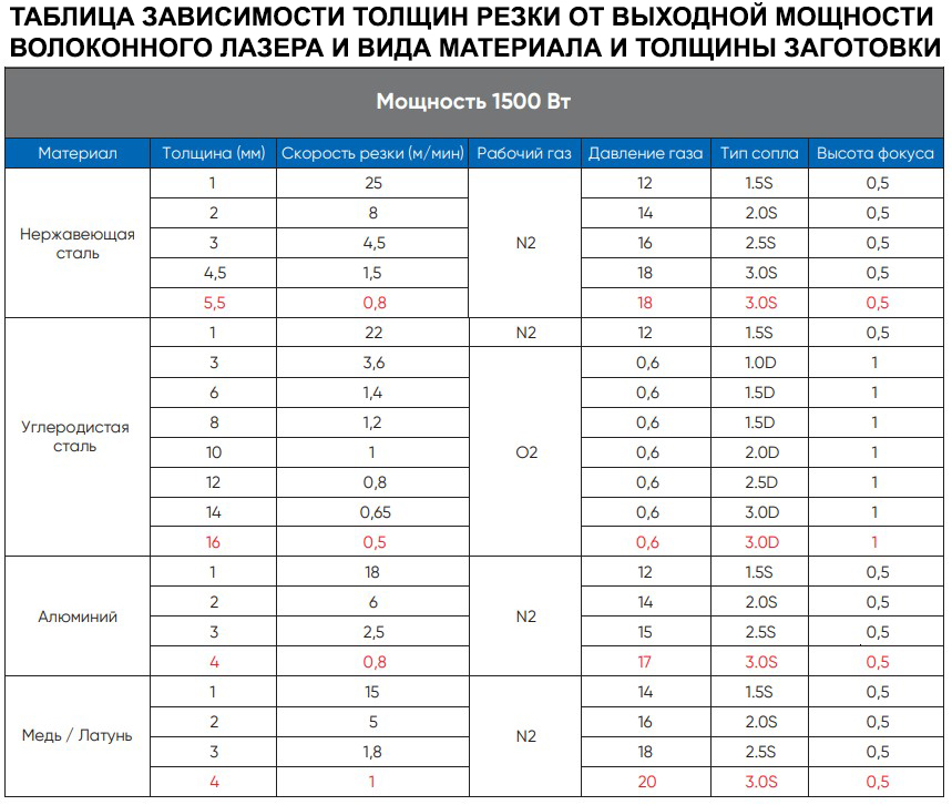 ВОЛОКОННОГО ЛАЗЕРА И ВИДА МАТЕРИАЛА И ТОЛЩИНЫ ЗАГОТОВКИ