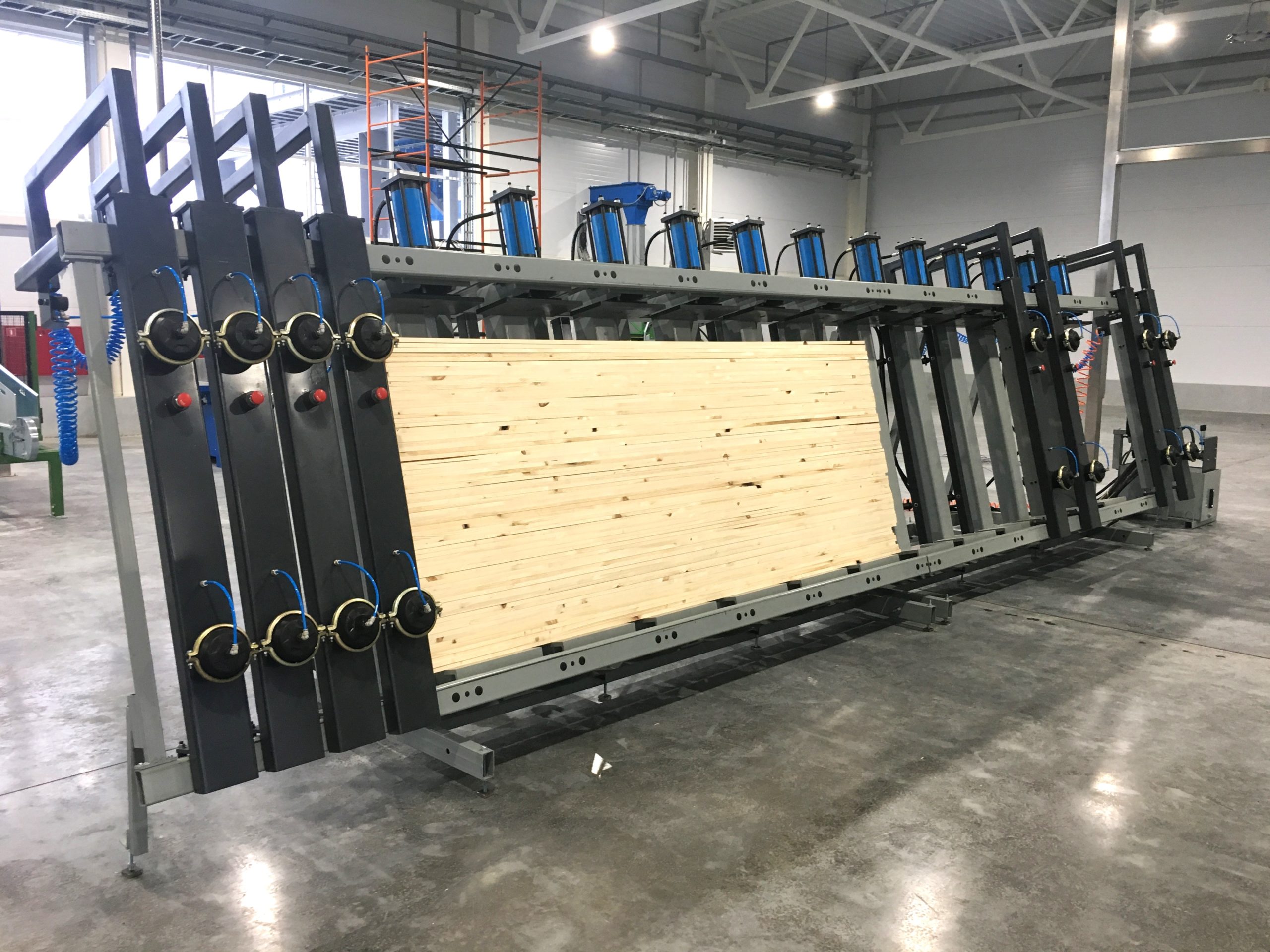 Вайма гидравлическая оснащена откатными пневматическими фронтальными прижимами. Их перемещение за пределы рабочей зоны обеспечивает свободный доступ при укладке и выгрузке. Откатные пневматические фронтальные прижимы гарантированно выравнивают и удерживают пакет заготовок во время прессования.
