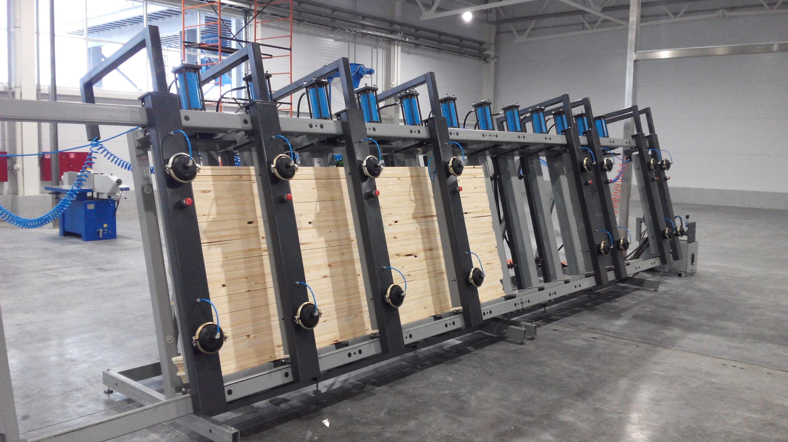 Вайма гидравлическая оснащена откатными пневматическими фронтальными прижимами. Их перемещение за пределы рабочей зоны обеспечивает свободный доступ при укладке и выгрузке. Откатные пневматические фронтальные прижимы гарантированно выравнивают и удерживают пакет заготовок во время прессования.
