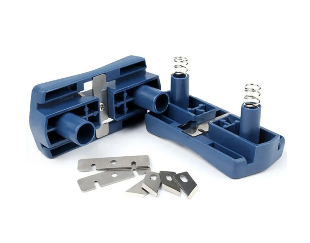 Продольный подрезатель кромки (ручное приспособление для двухсторонней подрезки кромки 0,3-0,6 мм). Подрезка осуществляется одновременно с обеих сторон. Ширина обрабатываемых кромок до 40 мм. При необходимости обрабатывать кромку шириной свыше 40 мм приспособление можно разобрать и использовать как два отдельных подрезателя.
