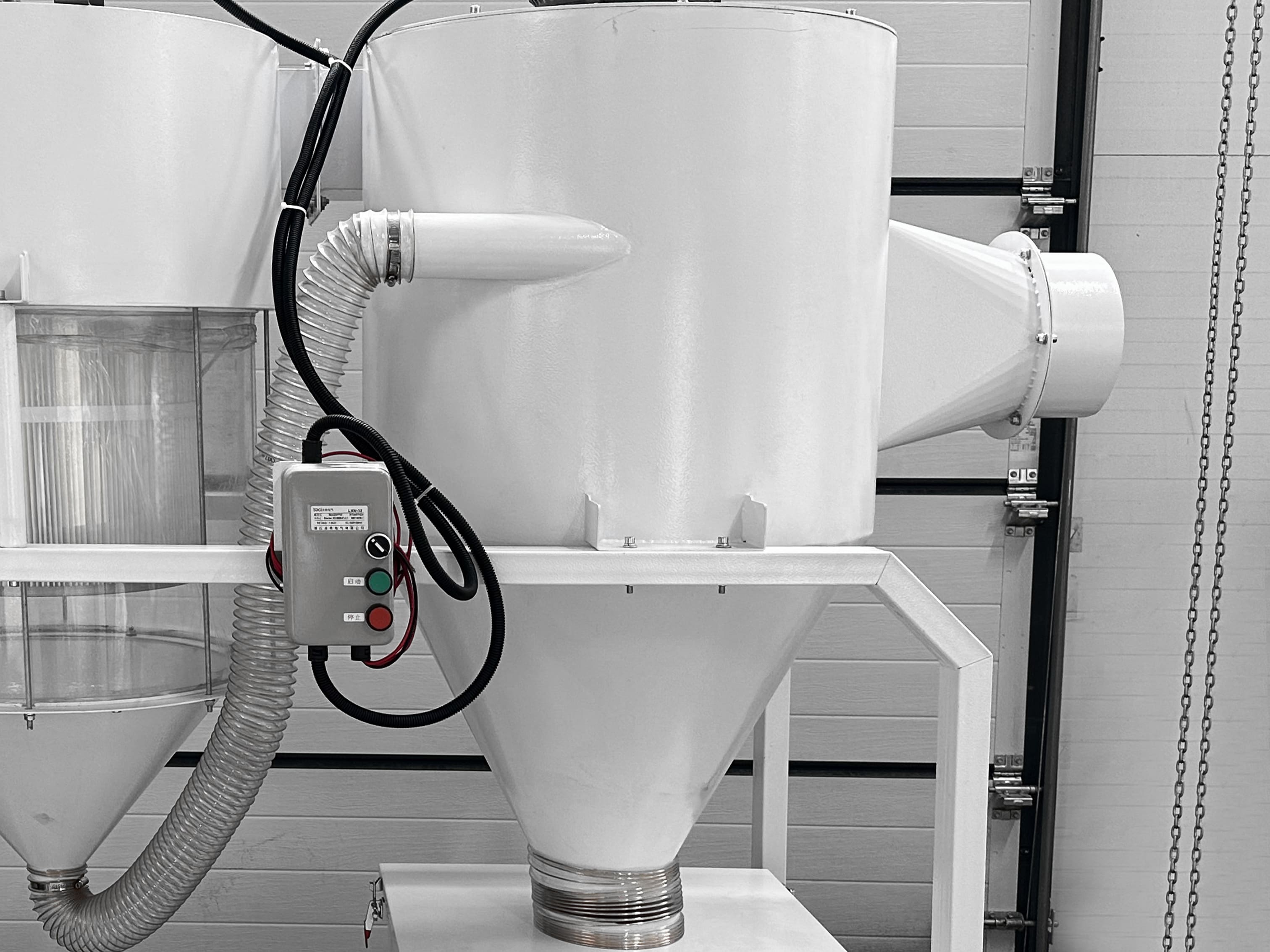 В данном отсеке происходит очистка воздуха от твёрдых загрязнений (стружка, опил и т.д.) при помощи центробежной силы происходит отделение «тяжелых» частиц от воздушного потока.