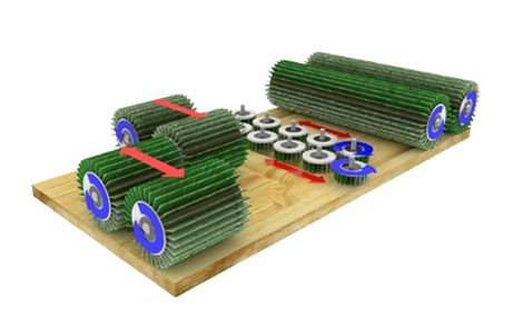 Первым этапом заготовка обрабатывается сдвоенным поперечными шлифовальным блоком, со спирально расположенными на барабанах щетками. Вторым этапом идет обработка сдвоенным блоком чашечных щеток. (Поперечный и чашечный блоки имеют механизм осцилляции) Третьим этапом обработки является Сдвоенный продольный шлифовальный блок (два барабана во всю ширину рабочего стола, с щетками расположенными по спирали)