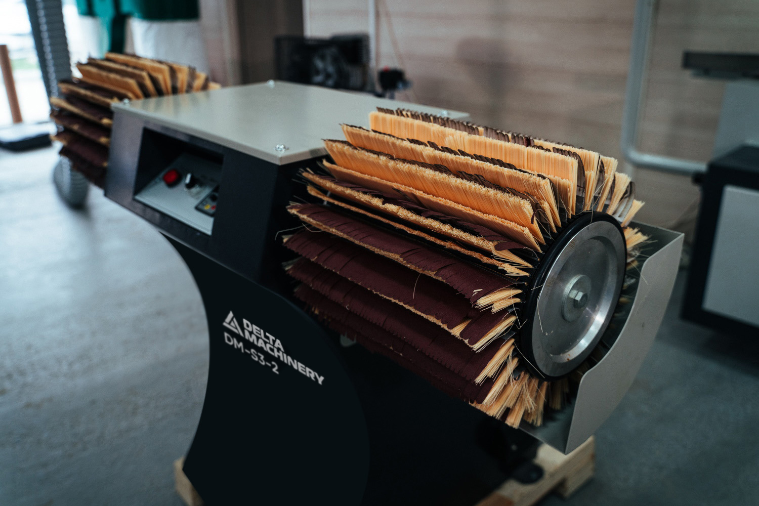 Станок оснащен двумя горизонтальными барабанами. Простая и удобная смена абразивных вкладышей и поддерживающих сизалевых щеток.