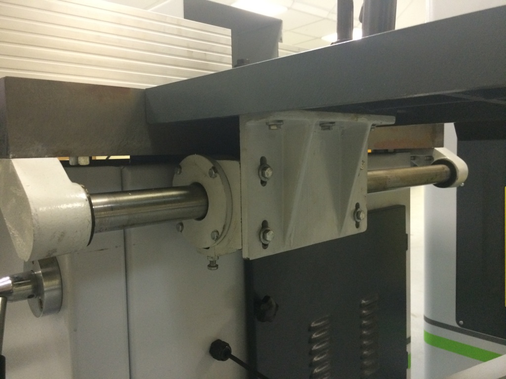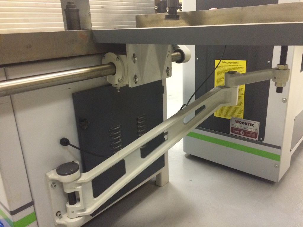 Перемещение шипорезной каретки на линейных подшипниках по массивной цилиндрической направляющей. Направляющая жестко закреплена в 2-х опорах. Подшипники изолированы от стружки и пыли в закрытом блоке.