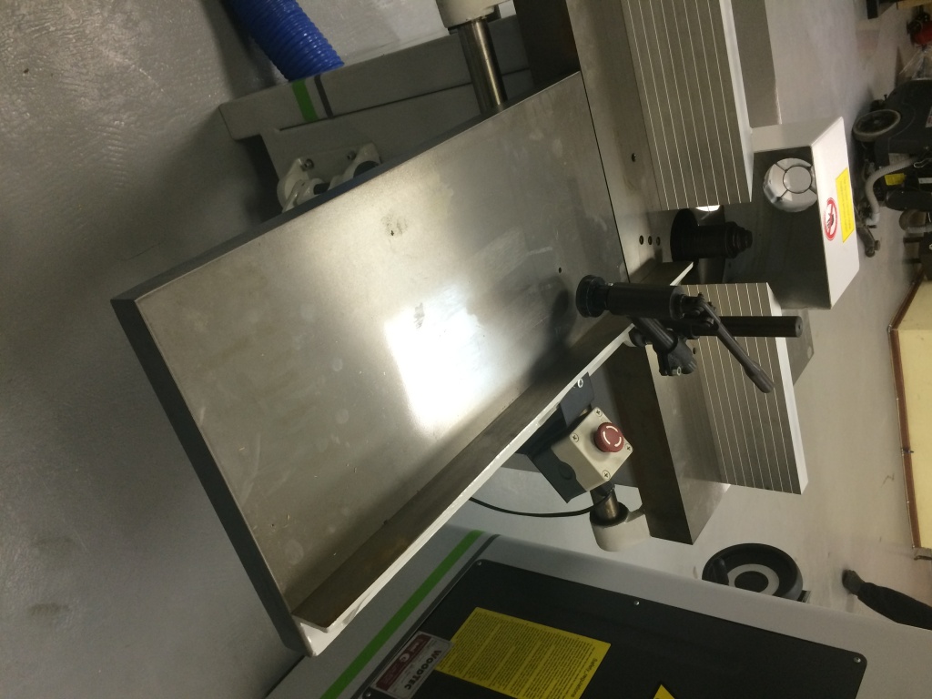 Зарезка шипов и проушин с помощью чугунной шипорезной каретки размером 650 х 350 мм. На каретке расположена кнопка аварийного выключения станка. Базирование заготовки по направляющей.