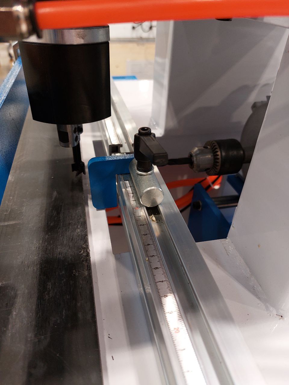 Сверление по вертикали происходит сверлильной группой с цанговыми зажимами, установкой сверла в патрон и протяжкой винтами шестигранниками