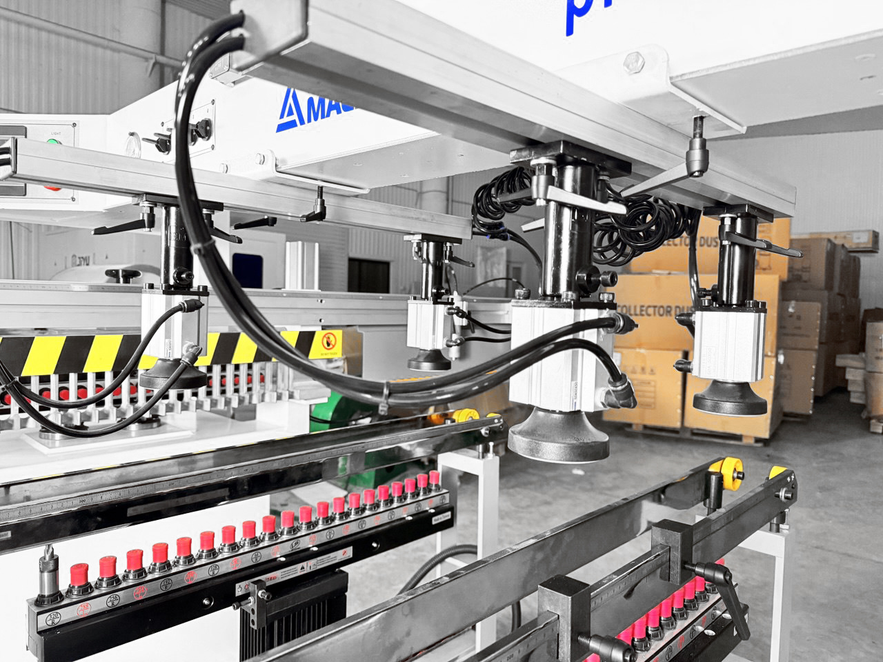 За позиционирование детали по глубине отвечают 2 пневматических упора , выбор необходимых упоров производится с помощью переключателей на центральной панели, что значительно сокращает время позиционирования детали и сокращает время присадки