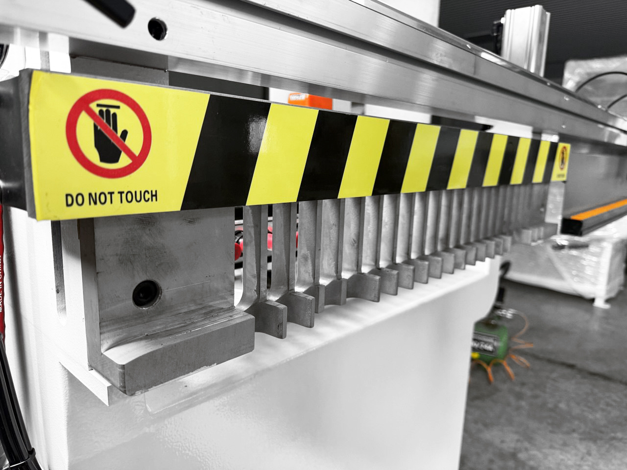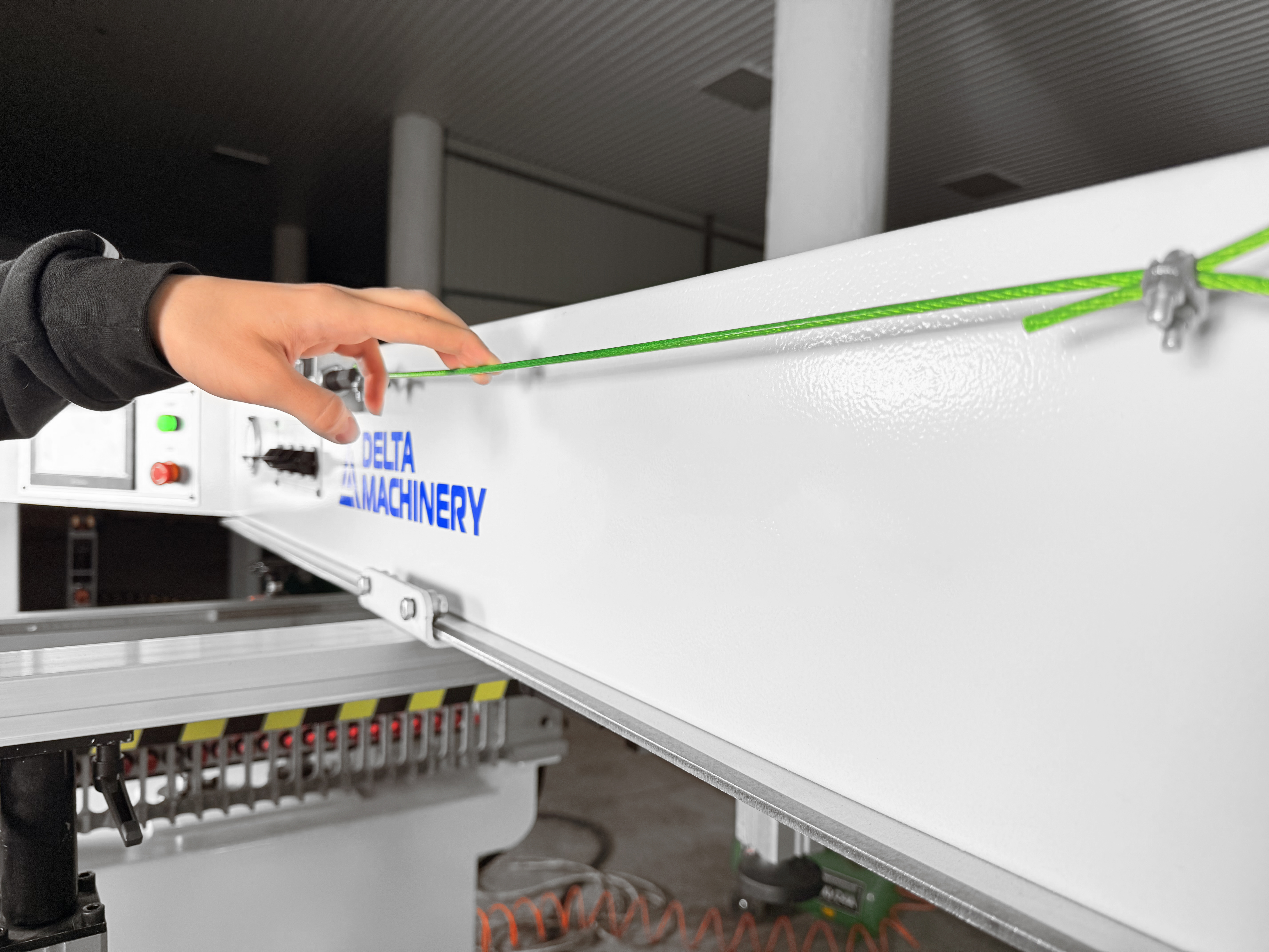 Для обеспечения дополнительной безопасности при работах, на передней части станка, по всей ширине рабочего места оператора проложен аварийный торс отключения станка, это поможет избежать травм или брака при возникновении нештатной ситуации. Оператор всегда сможет быстро произвести аварийное отключение