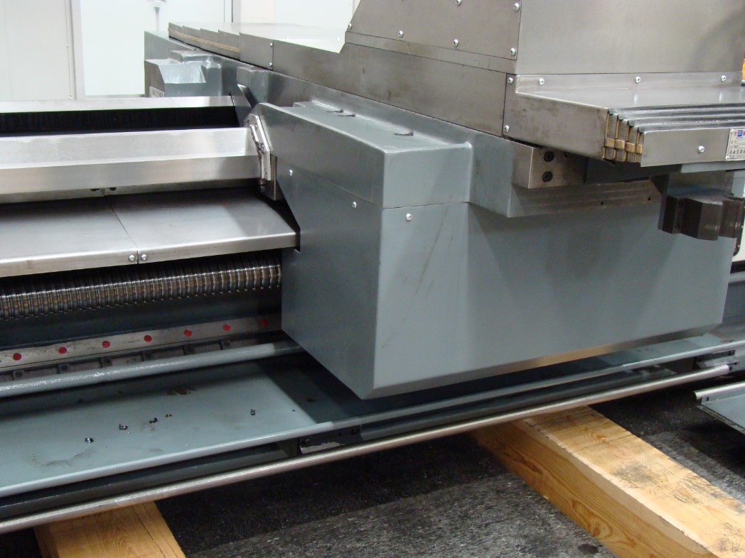 Мощная цельнолитая станина с широко разнесёнными направляющими и дополнительными ребрами жесткости отлита из чугуна. Такая конструкция станины обеспечивает повышенную жесткость, виброустойчивость и способна выдерживать большие нагрузки. Возможна обработка деталей массой до 8 т (при зажатии в центрах и люнетах).