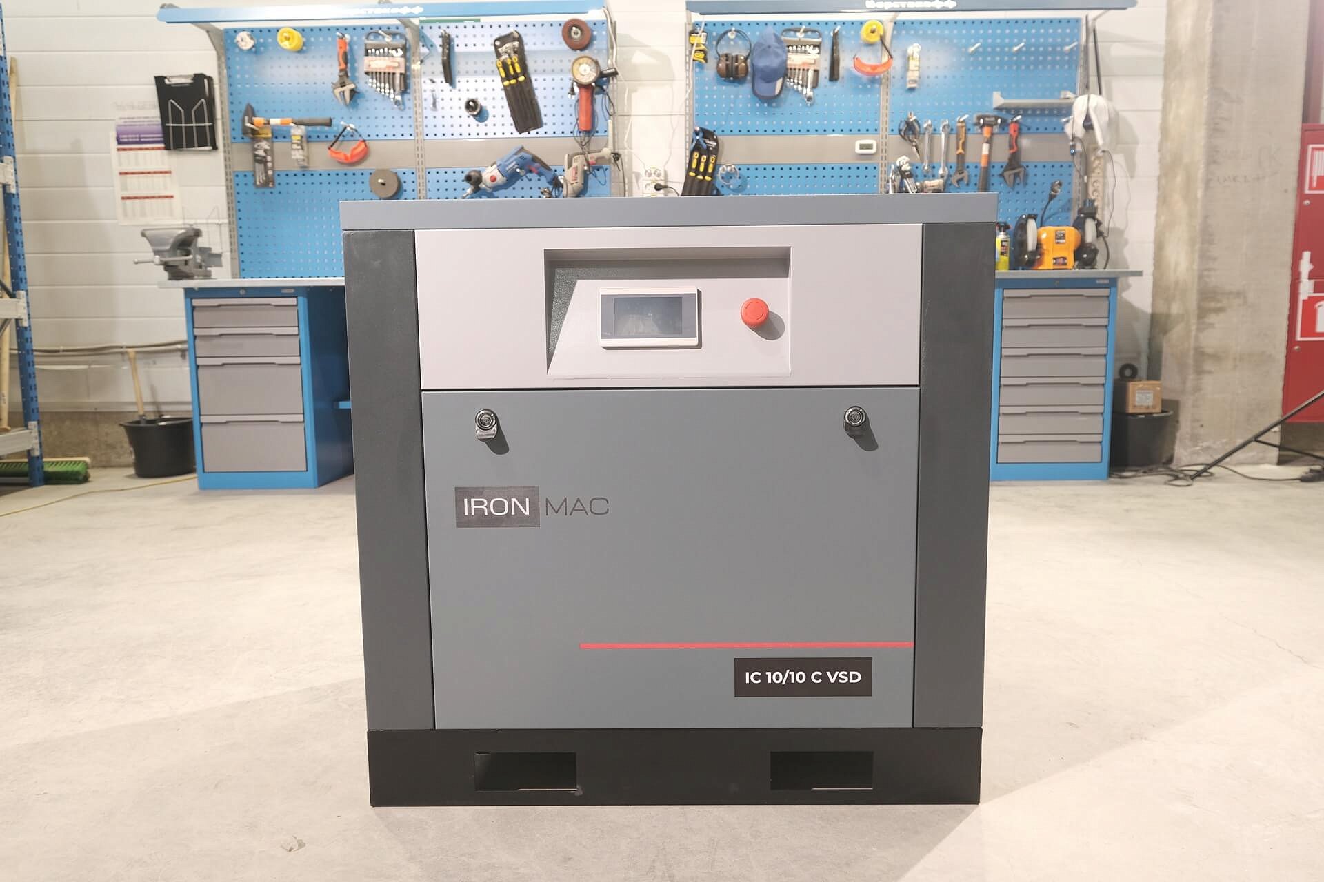 Винтовой компрессор IronMac IC C VSD IP 23 из профессиональной линейки, собран на прочной стальной раме. Компрессор предназначен для малых и средних предприятий, а все узлы конструкции фиксируются к жесткому основанию и дополнительно изолируются от вибраций. На серии C VSD реализована система прямого привода, а двигатель имеет уровень защиты по классу IP 23 с высокой степенью эффективности отведения тепла.