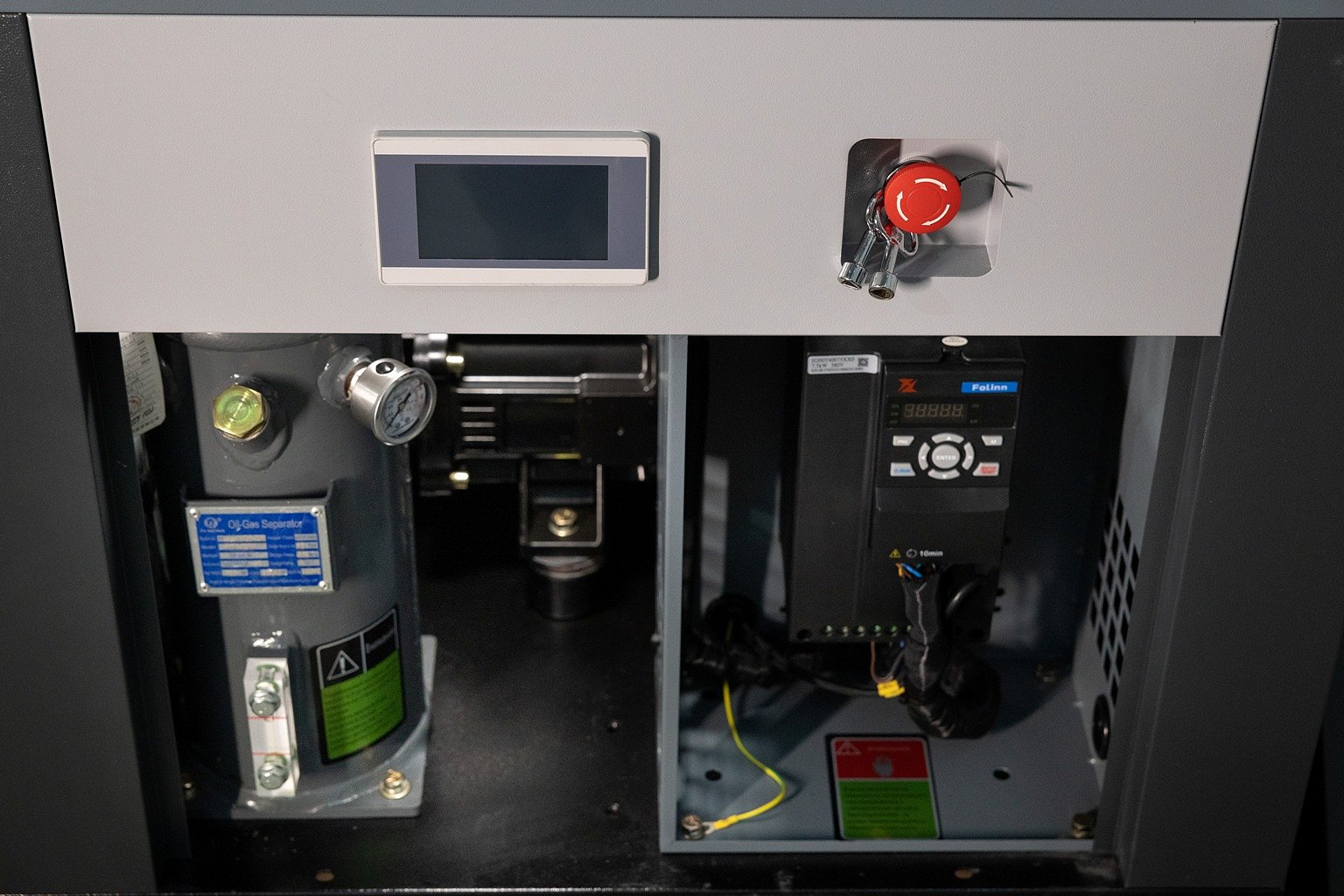 Частотный преобразователь Folinn обеспечивает плавный запуск и остановку компрессора, снижает пусковые токи двигателя и защищает устройство от перегрузок, короткого замыкания или потери фазы.